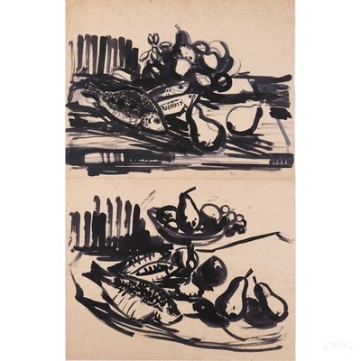 | KARL RÖDEL 2x TUSCHEMALEREI STILLLEBEN OBST FISCH POSTWAR HALLE UNIKAT VP: 1350* | 1 Gebote